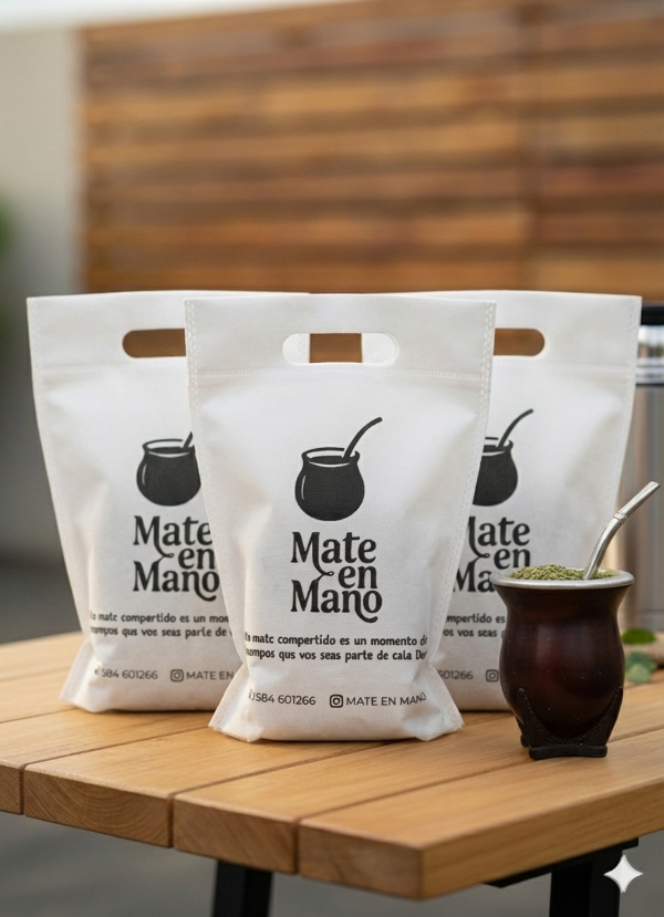 Bolsas de friselina tipo riñón, personalizadas a un color, ideales para emprendimientos, ferias y marcas.